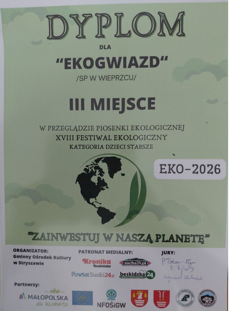 Uczniowie Szkoły Podstawowej im. Mieczysława Karłowicza w Wieprzcu zajęli III miejsce podczas Przeglądu Piosenki Ekologicznej w ramach XVIII Festiwalu Ekologicznego w Stryszawie. Zespół „Ekogwiazdy” zaprezentował utwór „Ziemia, nasze miejsce”.